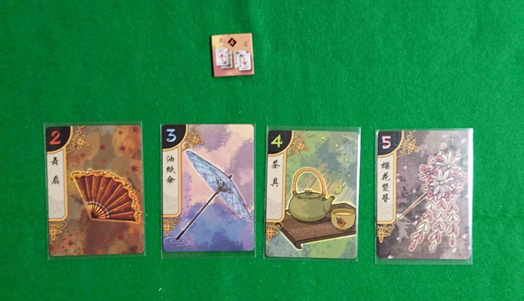 道具カードを4枚選び2枚ずつ2組に分けて公開します。相手プレイヤーは、そのうちどちらかの組の2枚を選び自分側の芸者カードの横に置きます。残りの2枚は手番プレイヤーが、自分側の芸者カードの横に置きます。