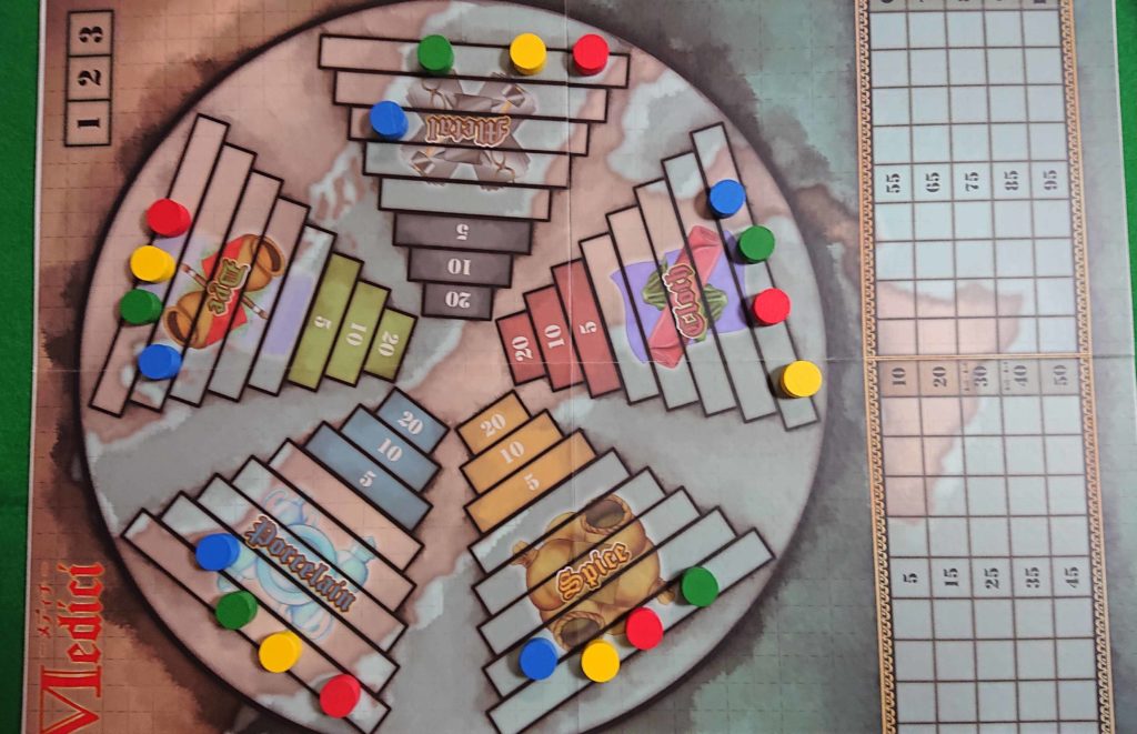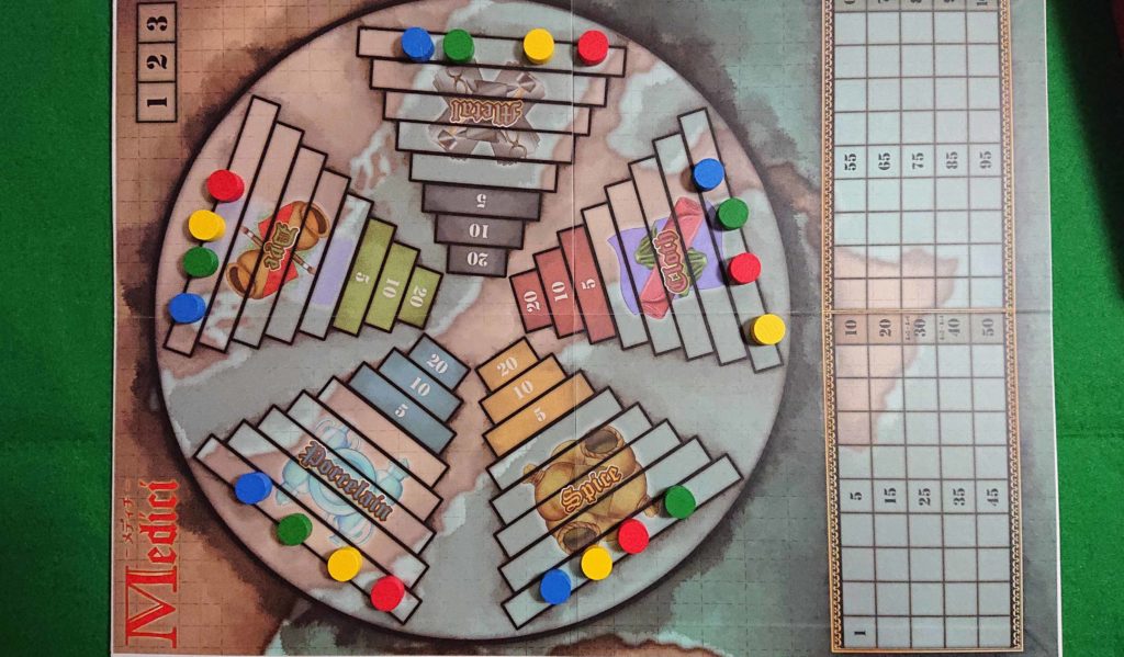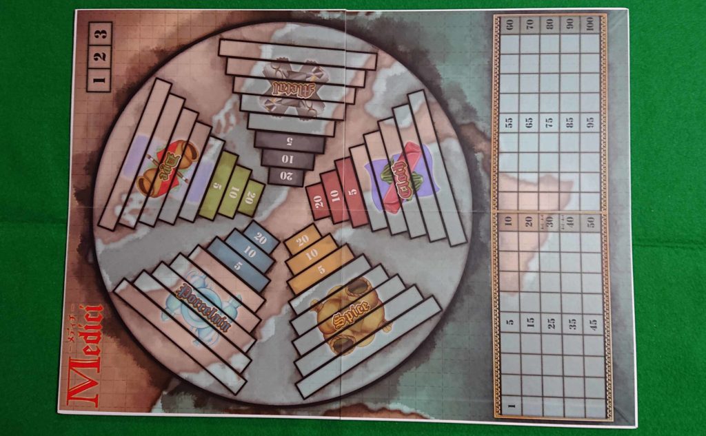 下がゲームボードです。左上の数字は、ラウンドトラックです。3ラウンドでゲーム終了です。中央の5個の三角形は、各商品をどれだけ獲得したかを表す商品トラックです。右は、お金を表す所持金トラックです(これがそのまま勝利点になります)。つまり1番お金を稼いだプレイヤーの勝利となります。