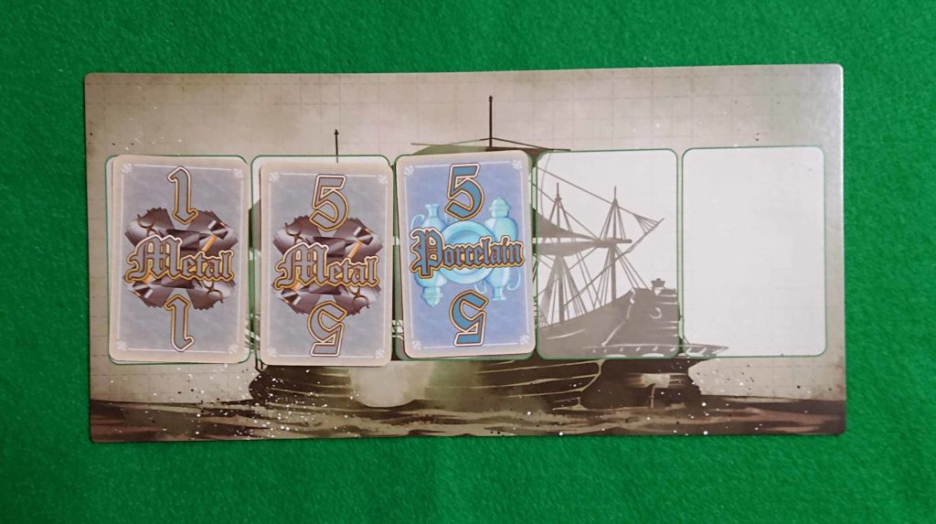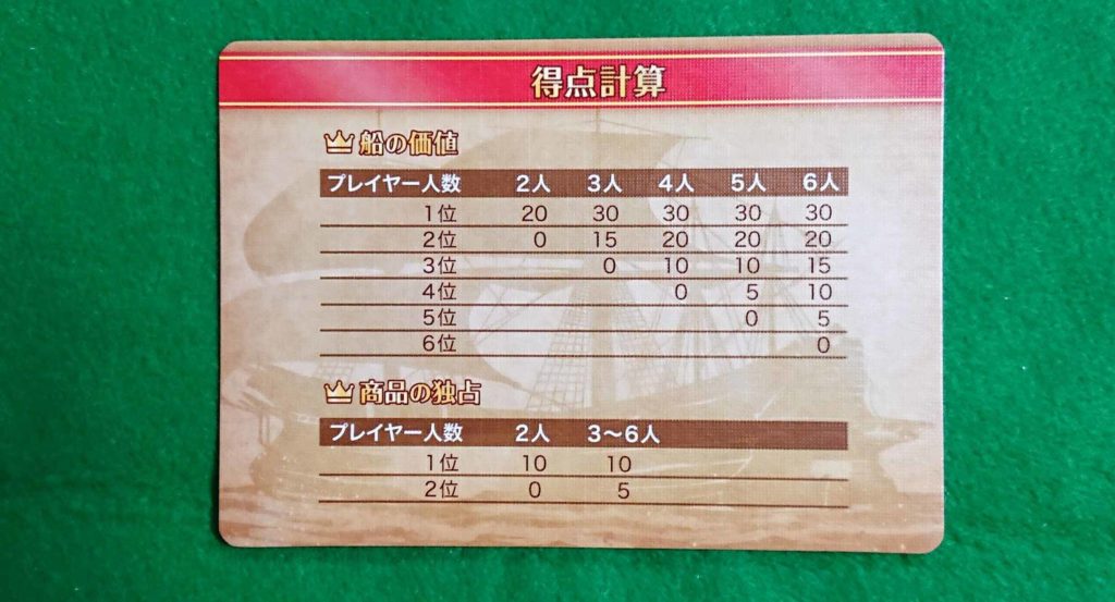 各プレイヤーは個人ボードある商品カードの数字を合計します。合計した数字が大きいプレイヤーから、下のような「船の価値」だけの数字だけ所持金トラックのマーカーを進めます。(ゲーム人数によって異なります。)
