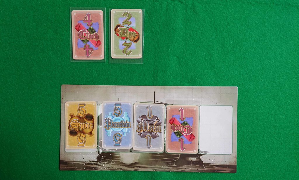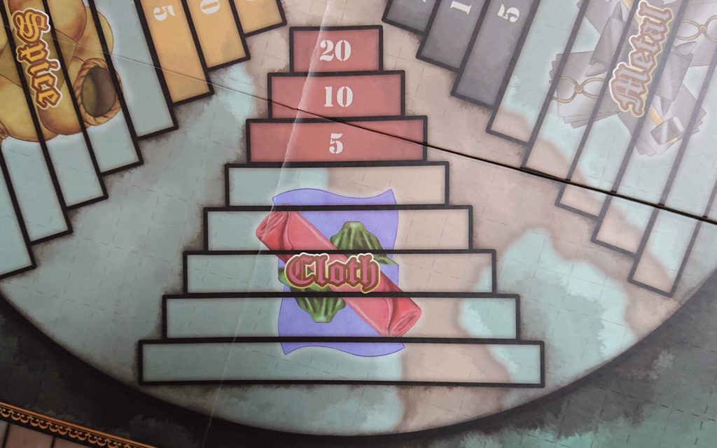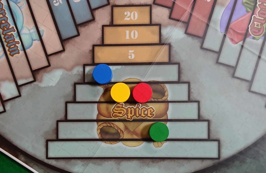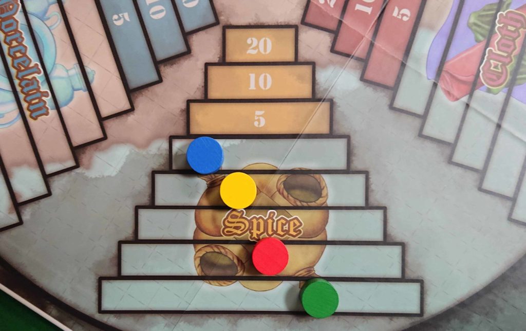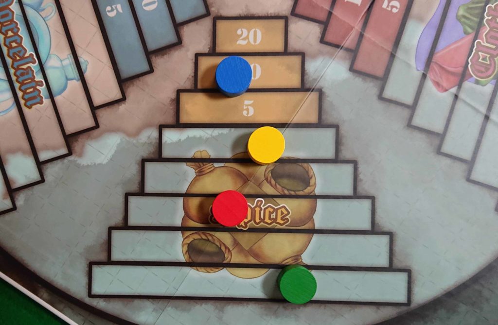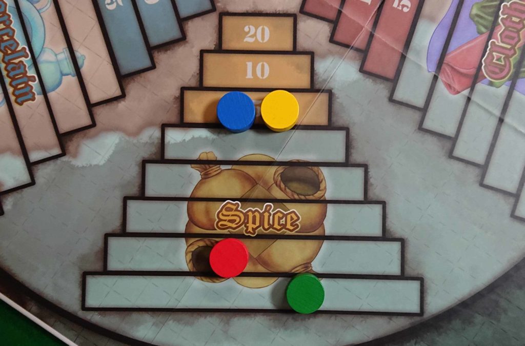 プレイヤーは今獲得したカード、金物(灰)2枚・陶器(青)1枚・香辛料(黄)1枚・染料(緑)1枚の数だけ、ゲームボードの対応する商品トラックをマーカーを進めます。