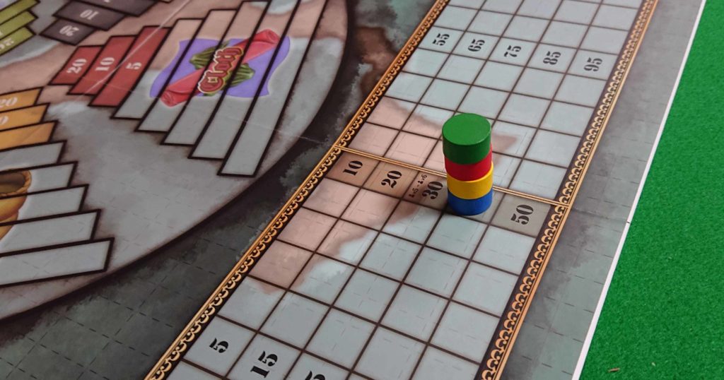 所持金トラックの40点のところに各プレイヤーの色のマーカーを置きます。これが最初に持っているお金を表します(プレイヤー人数2人~4人の場合、5人・6人の場合は30です)。