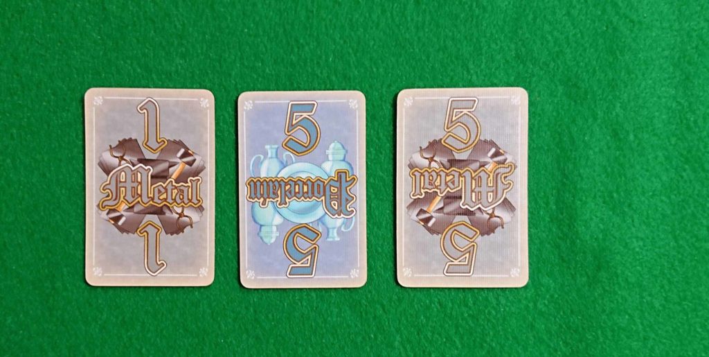 商品カードの価値も大事ですが、どの商品カードの種類をたくさん集めるかも大事です。商品の勝ちと枚数の2つのことが勝利ポイントに重なっているので、場に出ている競りの商品カードに、どれだけの値段を付けるのかが悩ましいゲームです。値段の付け方も最初は難しいですね。