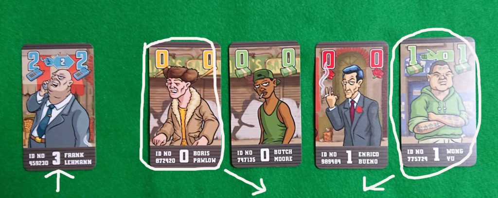 下の写真のように、ランク2の仕切屋カードを1枚組事務所に出し、組事務所のカード2枚を手札に加えました。