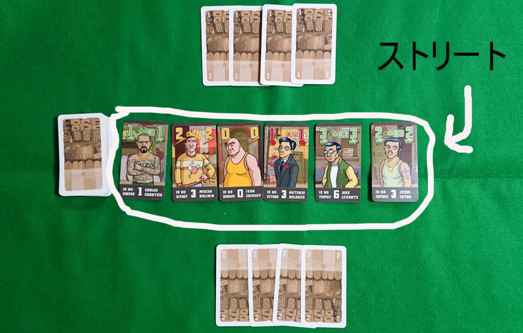 下の写真のように、残りのカードをよくシャフルして、6枚表にして並べます。これをストリートと呼びます。残りのカードは山札として場に置きます。上と下のカードは各プレイヤーの初期手札です。
