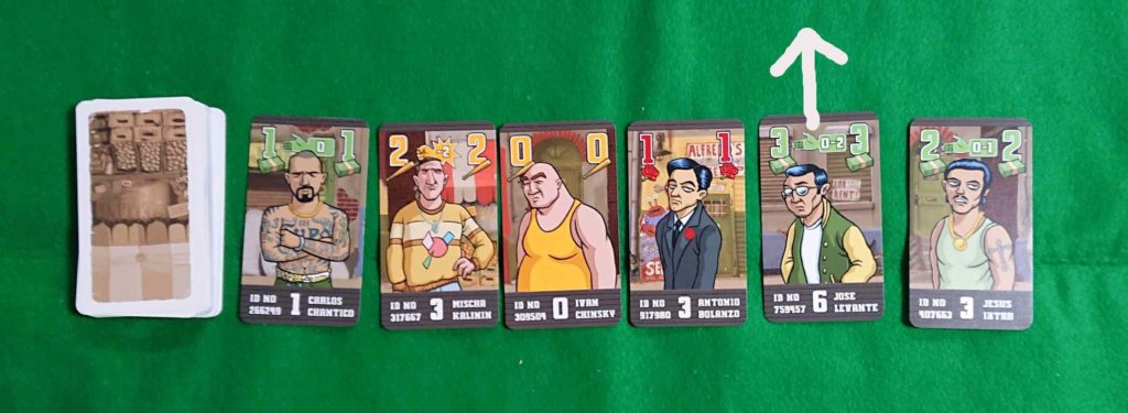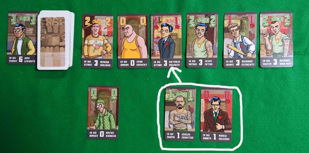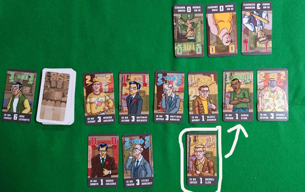 ストリートからカードを1枚取ることが出来ます。ランク0の場合は、無条件で取れます。ランク0以外の場合は、ランクが1つ低い同じ種類2枚のカードを出すことで獲得することが出来ます。獲得したカードは手札に加え、低いランクのカード2枚のうち1枚は組事務所に置きます。もう1枚は手札に戻します。