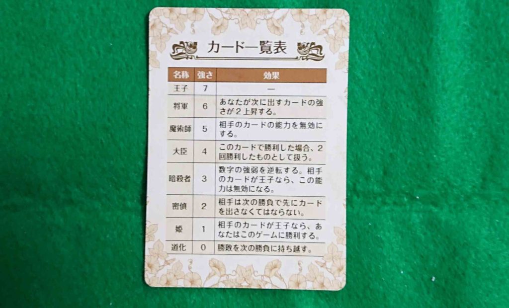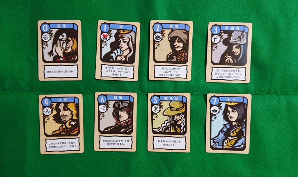 各プレイヤーは、0から7までの数字が描かれたカードをお互いに手札として持ちます。下の写真のように、各カードには特殊な能力があります。左上の数字は各カードの強さを表します。