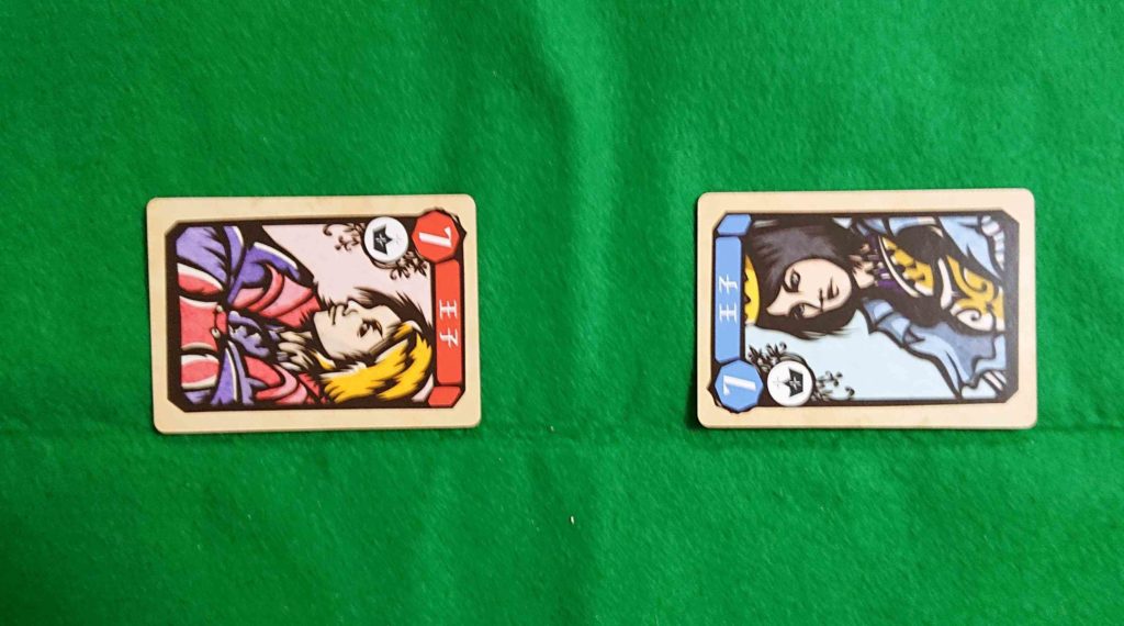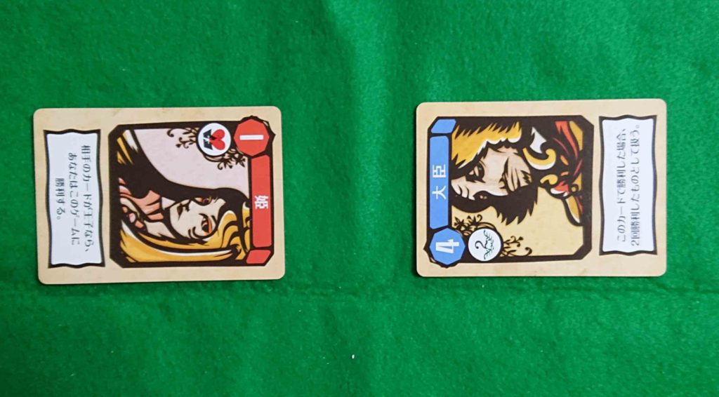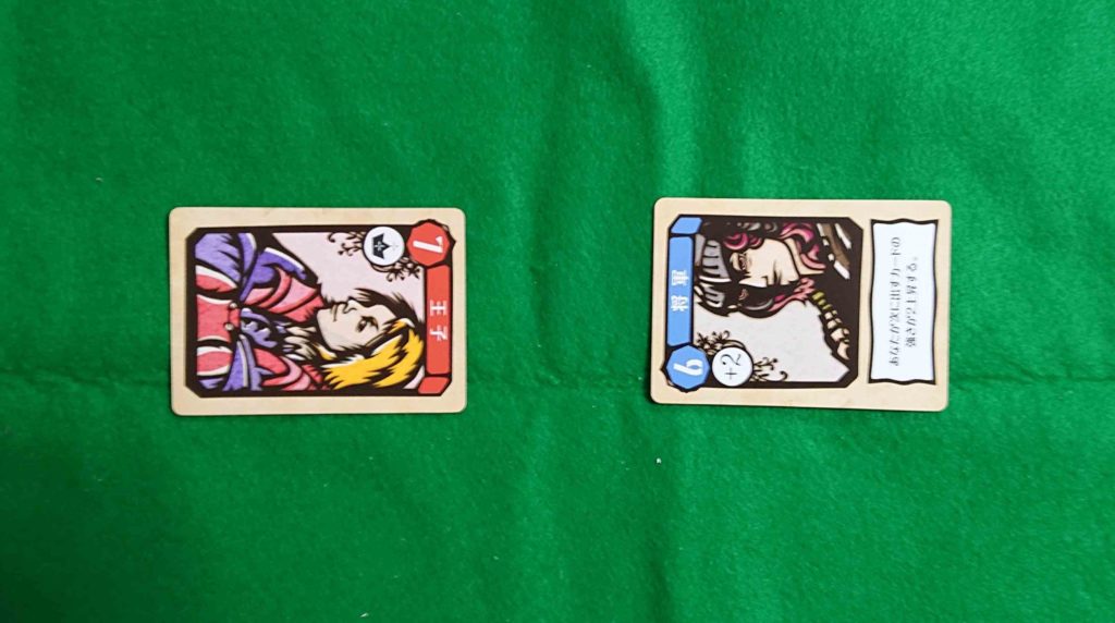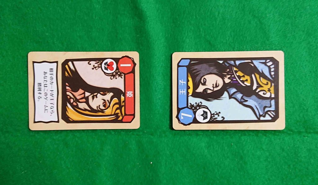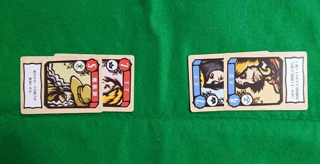 基本は、数字の大きい方の勝利です。下の写真の場合、赤の7の王子を出したプレイヤーの勝利です。