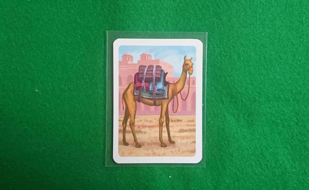 プレイヤーの間に、ラクダカードを3枚並べます。その後品物カードとラクダカードをよくシャフルして、ラクダカードと並べて場に2枚出します。この5枚をを市場と呼びます。