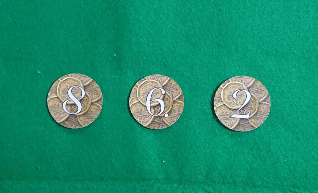 同じ品物を、5・4・3枚セットで売却した時の、ボーナストークンです。裏側にランダムに数字が書いてあり、それが勝利点になります。