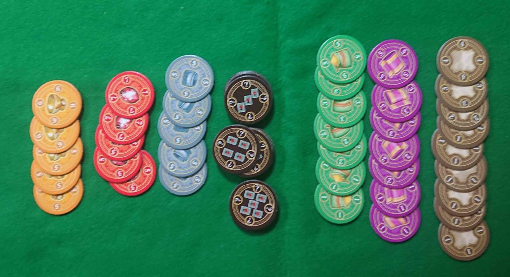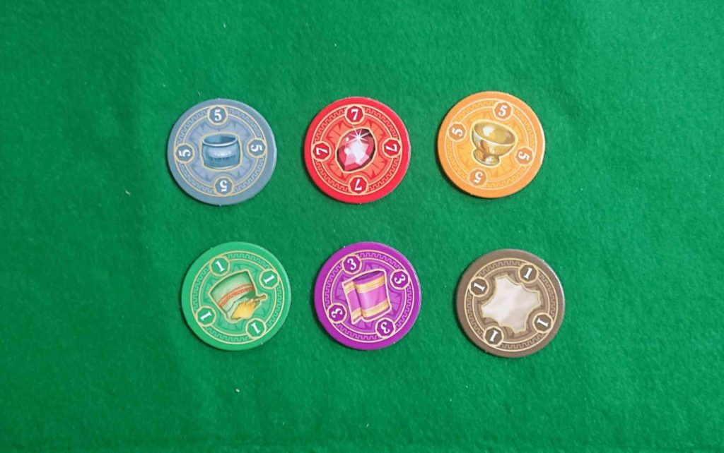 下が、各品物を売却した時に、もらえる品物トークンです。品物カードより1枚少ない数だけあります。数字は、獲得した時の勝利点です。