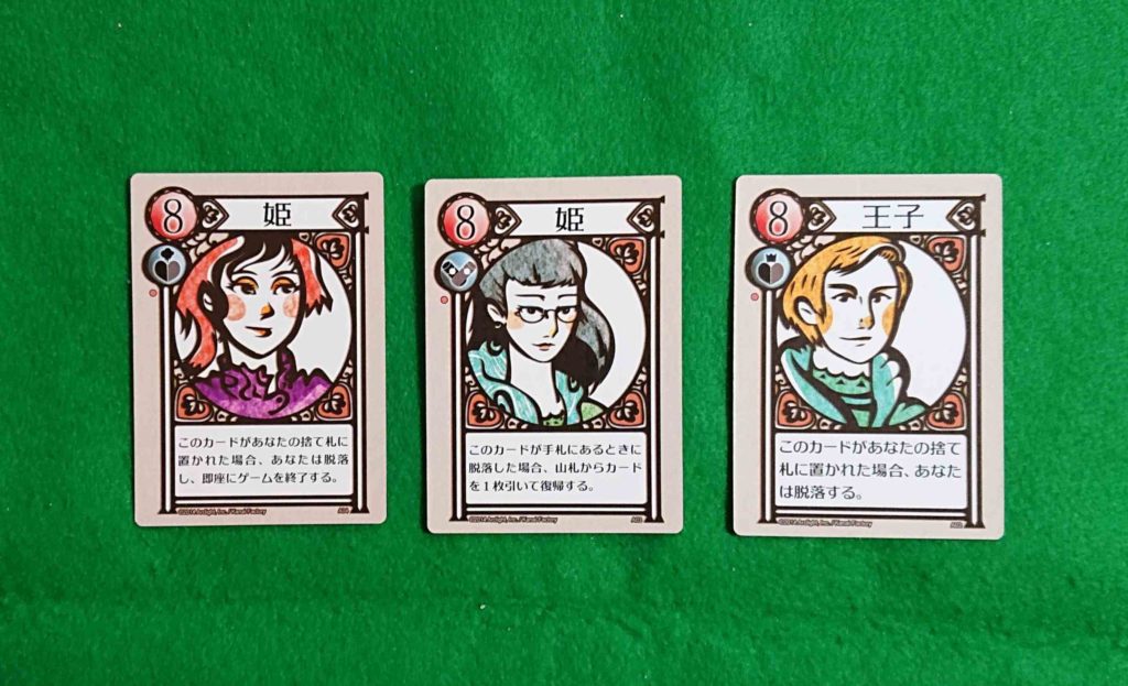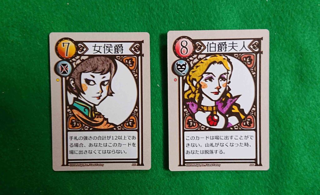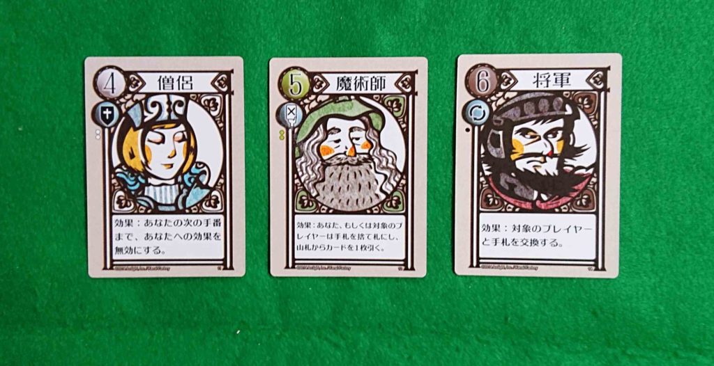 これを時計回りに繰り返していきます。山札が無くなるか、1人以外すべて脱落した場合にゲーム終了です。
