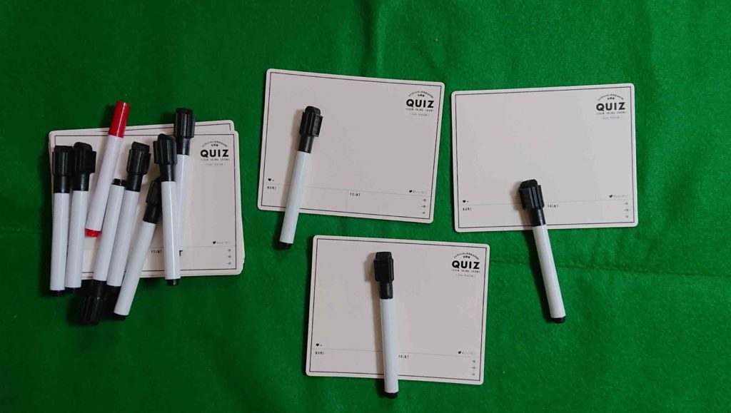 回答するプレイヤーは、回答ボードに答えを書きます。問題の回答は数字を記入します。全員が書き終わったら、一斉にボードを表にします。回答の数字を小さい順に並べます。