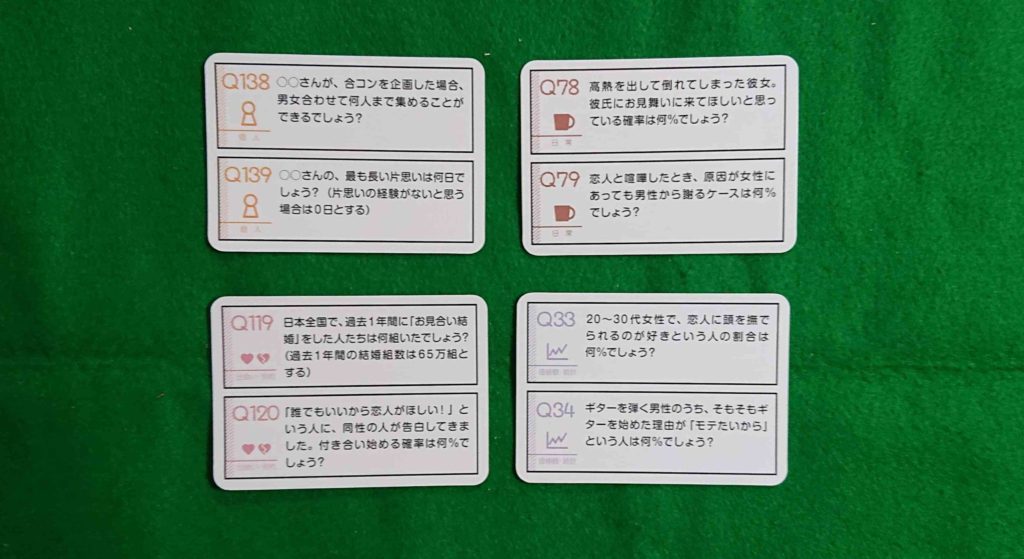 問題カードは40枚(問題数156題)あります。問題は、価値観・統計、日常、出会い・別れ、個人の4つのジャンルがあります。