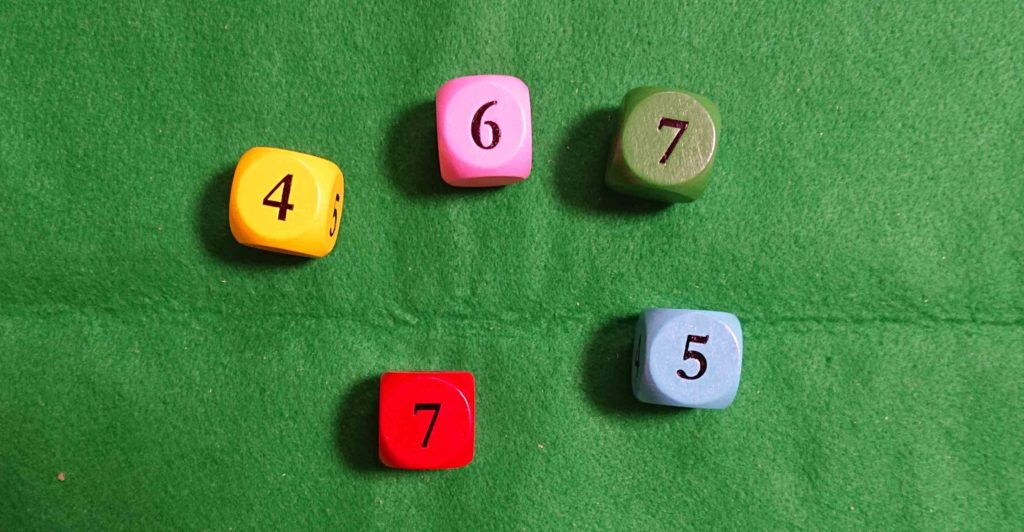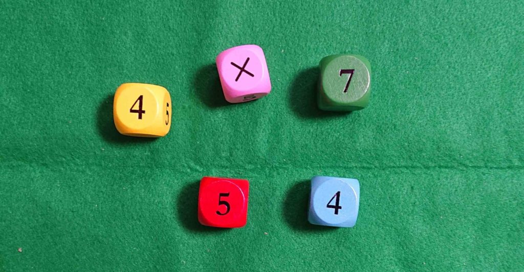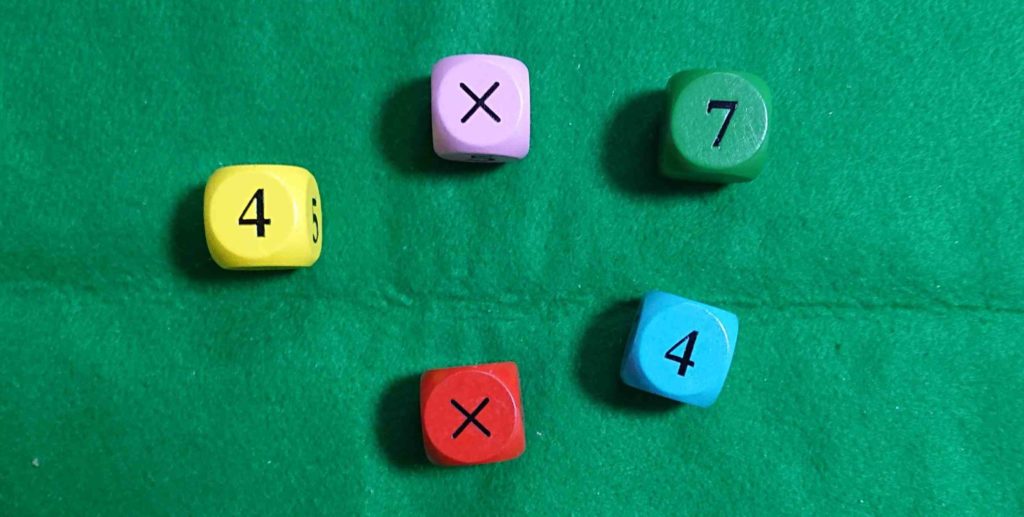4・5・6・7・×があるダイスが5個あります。このダイスは振りません。各プレイヤーが1個ずつ持ち、次にどれだけイモムシを進ませるかを示すために使います。