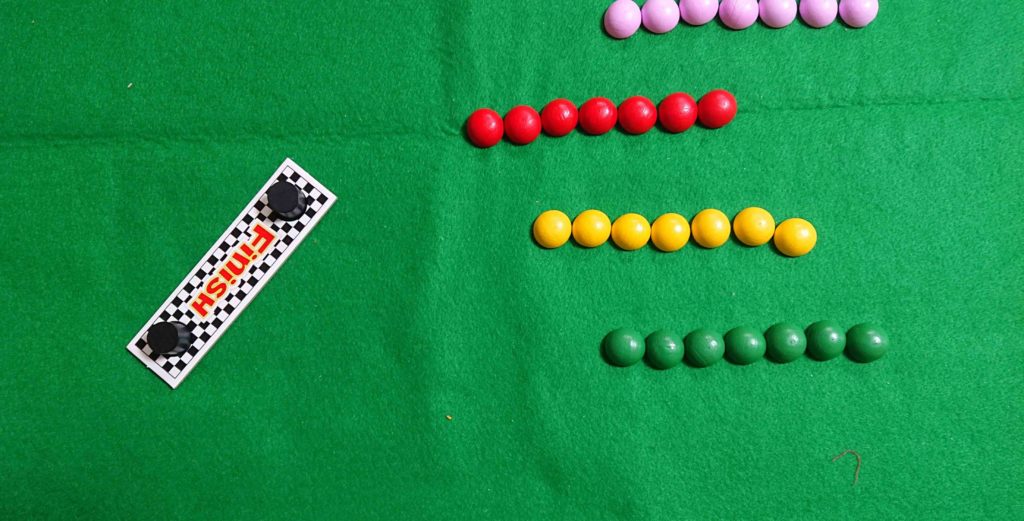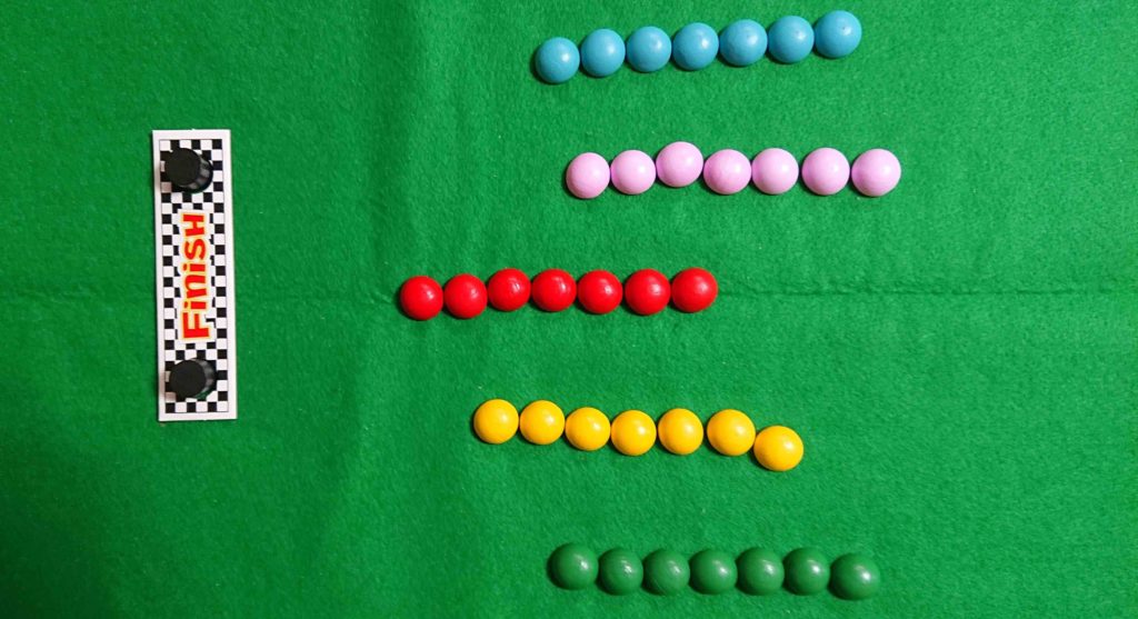 イモムシを並べ、適当なところ(60cmくらい)にフィニッシュラインを置きます。これで準備完了です。