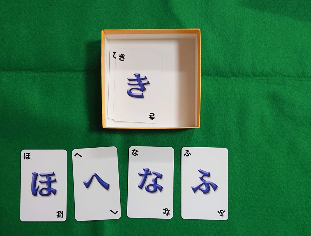 多人数で遊ぶしりとりカードゲームです。箱に入っているひらがなから始まり自分が持っている手札のひらがなで終わる言葉を言います。1番早く言えたら、その手札を箱に入れます。今度は、そのひらがなから始まる答えを言わなくてはいけません。