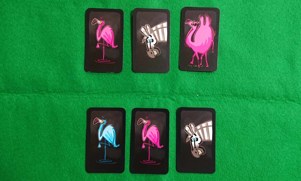 カード3枚の状況をみて、色や動物の種類、またある条件が揃ったら「ドデリド」と叫ぶ、そのカードに応じた言葉を言っていきます。