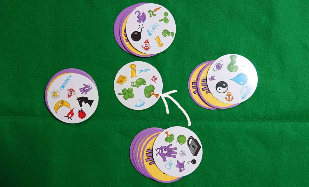円形カードに描かれた、同じ絵を見つけて、その名前を叫ぶゲームです。どの2枚のカードも必ず同じ絵が含まれている不思議なカードでいろいろなゲームが5種類楽しめます。
