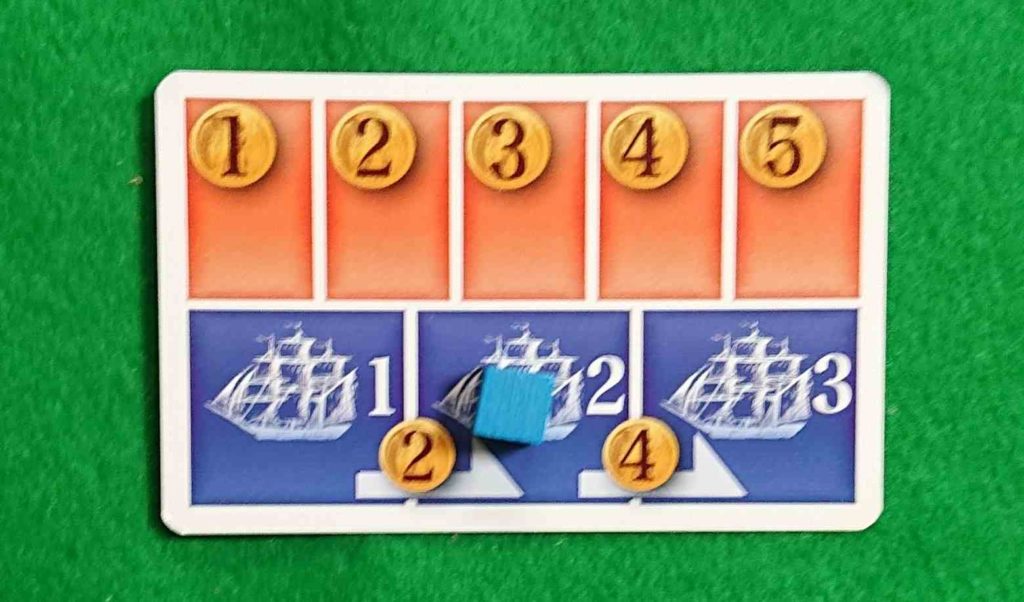スタートプレイヤーから順番に、金庫造船技術カードの上の2金、2金、3金、4金にコマを置きます。