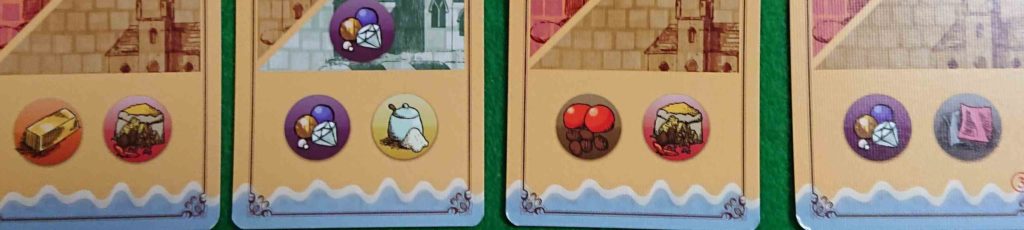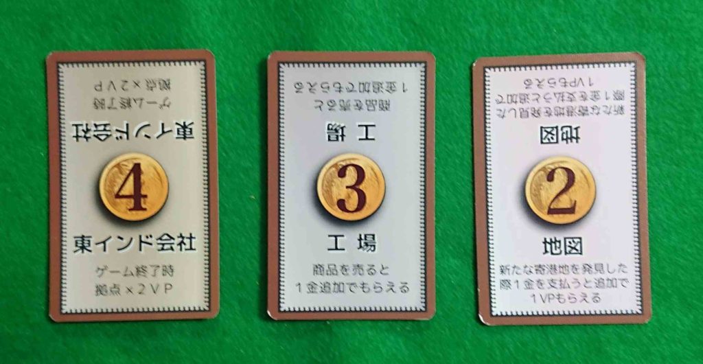 コマは各プレイヤー10個しか無いので、船・商品・建物・お金・勝利点のどれに使うのかを考えていかなければならない点が悩ましいところです。