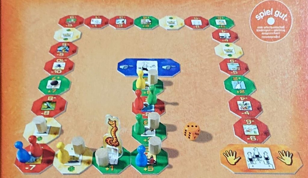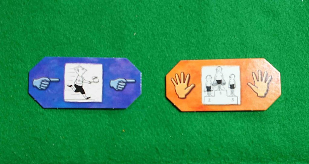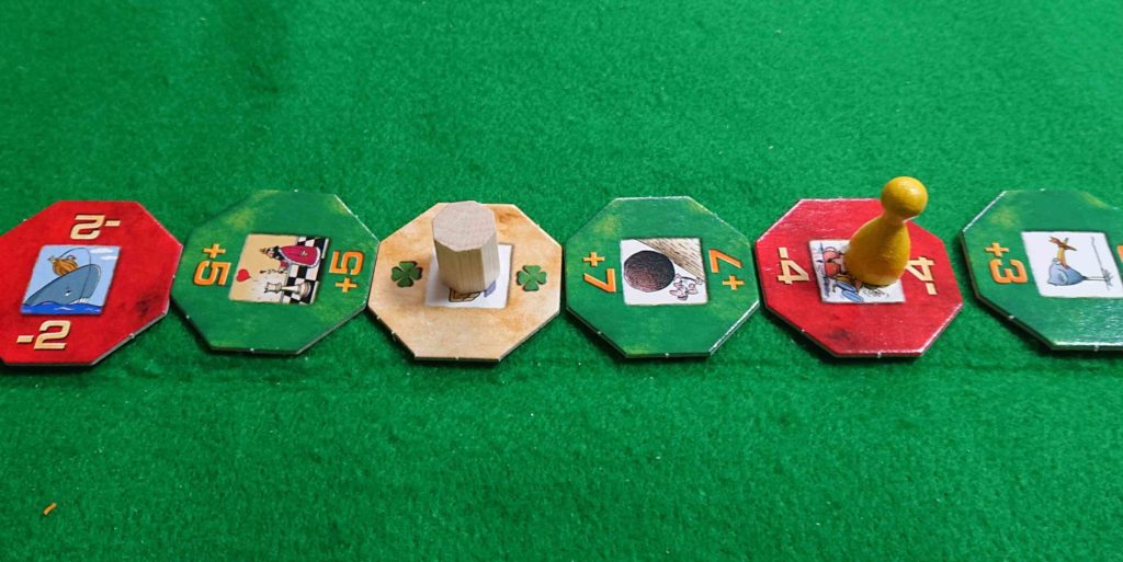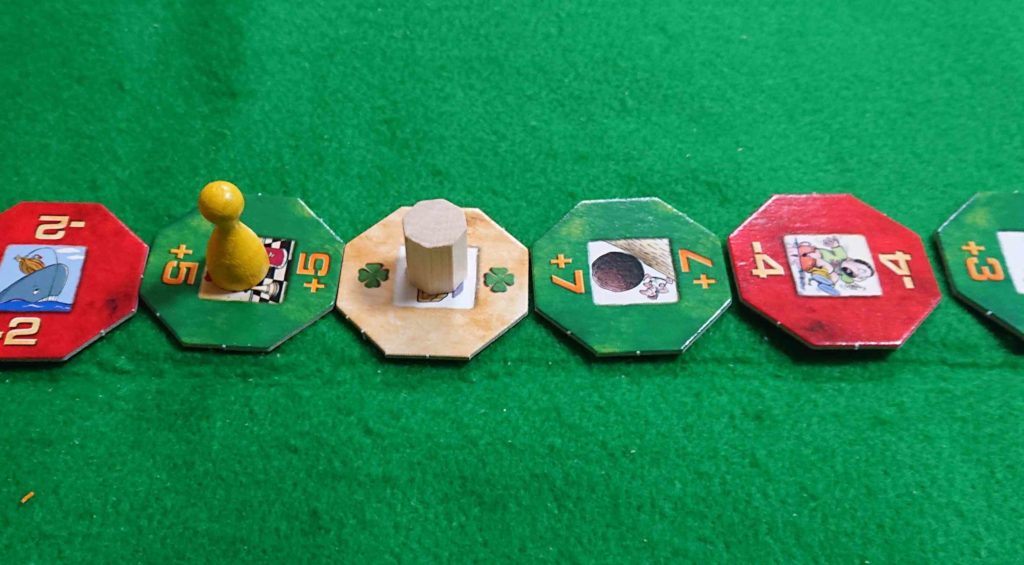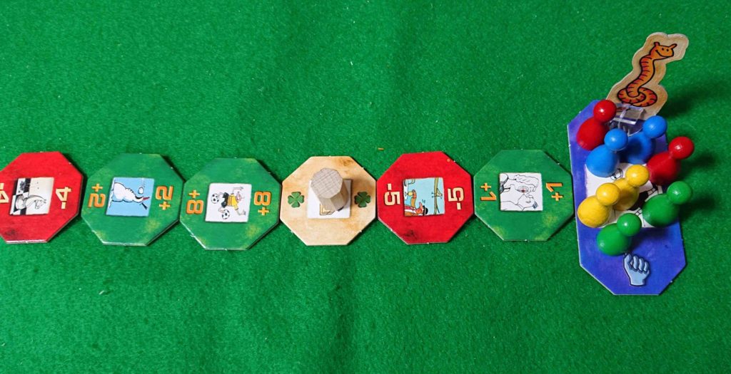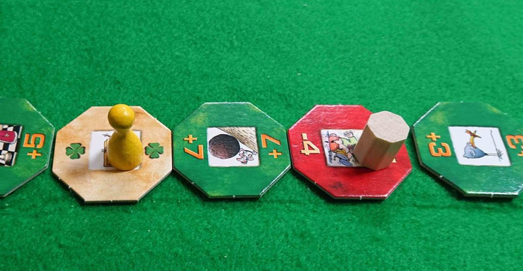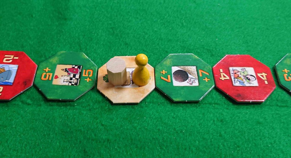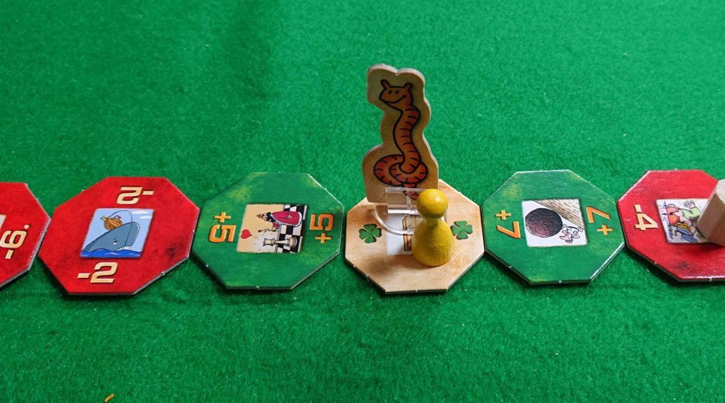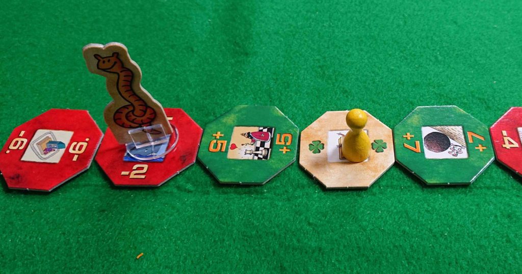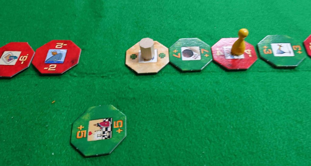 スタートからゴールまでに、得点タイルがあります。自分のコマが今いる位置から移動するとき、そこに他のコマが無い場合その得点タイルを取ることが出来ます。緑はプラス赤はマイナスの得点タイルです。