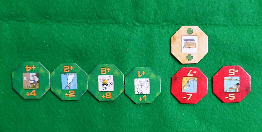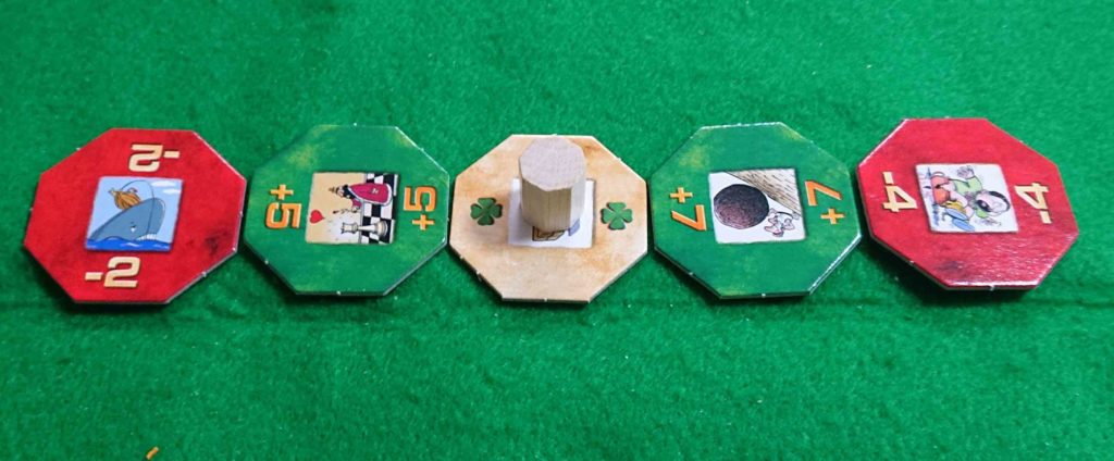 得点タイルです。左が赤いマイナスの得点タイル・中央が緑のプラスの得点タイル・右はラッキータイルです。ラッキータイルはマイナス得点をプラス得点に変えることが出来るタイルです。
