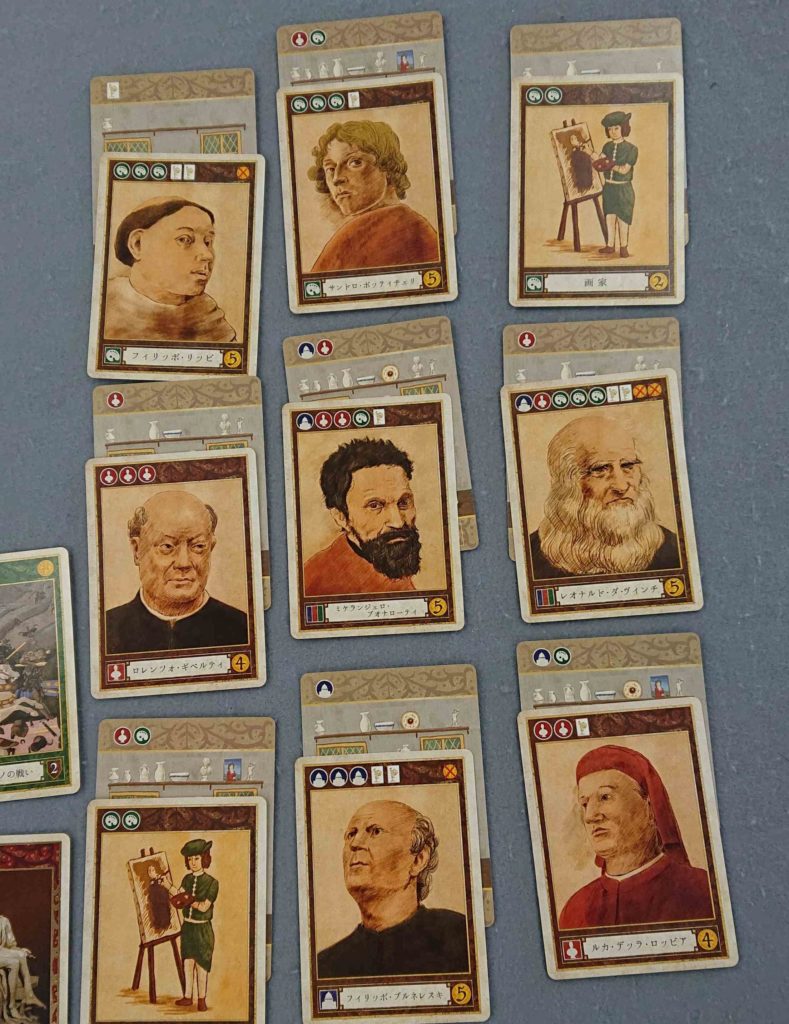 工房を競りで買ってその後芸術家を呼びますが、芸術家も競りで競り落とさなければなりません。芸術家のタイプは、絵画・建築・彫刻の3種類あります。普通の芸術家はどれか1つの才能しかありませんし、作れる作品の質も低いです。