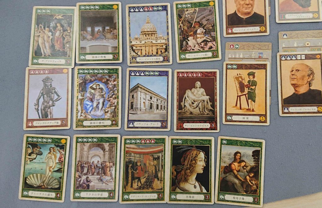 いろいろの芸術家を工房に配置して作品を作ってもらいます。インスピレーション(ひらめき)の数とお金を払って「作品カード」を引きます。その中に芸術家の分野と一致するカードが出た場合は自分のものとすることが出来ます。