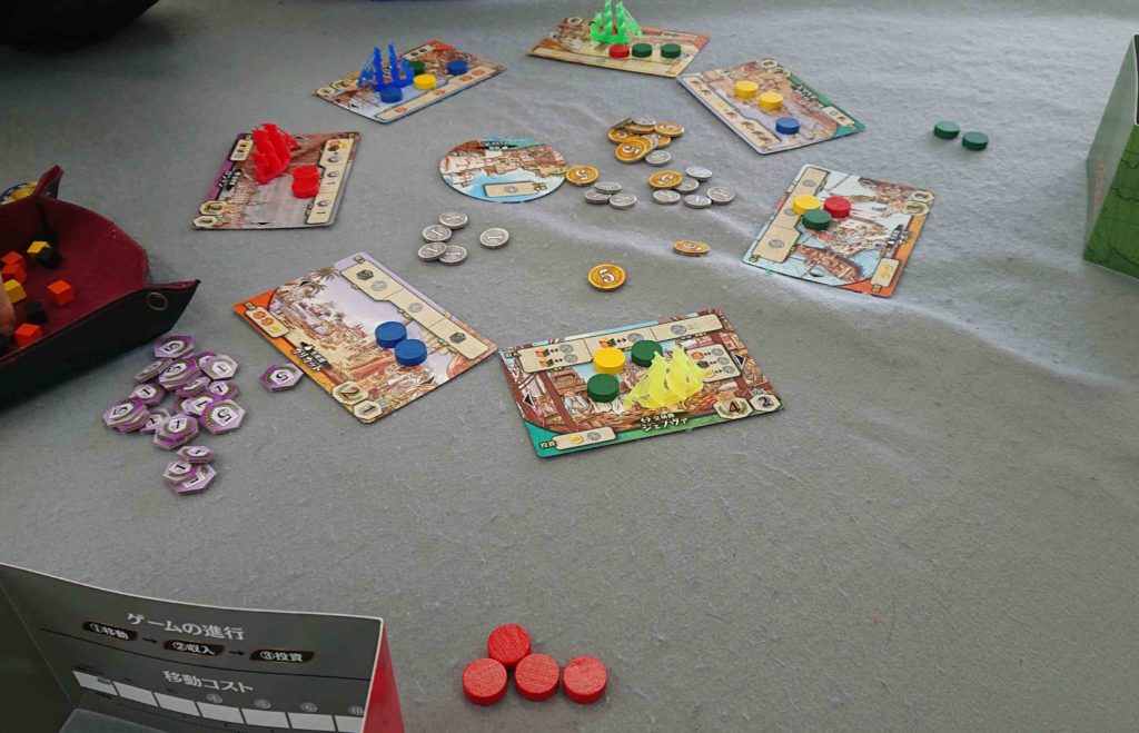 あとは勝利点をもらえる港にも投資チップを2個建てて、その港に着くと勝利点がたくさん入るようにしました。ゲーム終了時点で勝利点チップもかなりありましたが、投資チップが少なかったため、港の支配の勝利点が少なかったためその得点分が足りず勝利点では同率1位でしたが、投資チップの数で2位という結果でした。残念!
