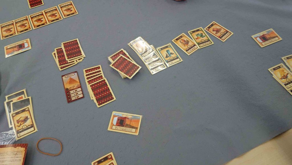 考古学カードゲームは3回目ですが、今回は最初の2巡で「砂嵐」カードが4枚中3枚出てしまうというハプニング?が起きてしまいました。最初の手札が4枚なので3回砂嵐カードがでて、全プレイヤーが手札1枚状態になってしまいました。手札少ない状況だと砂嵐カードが出ても全く痛くも痒くもないですよね。