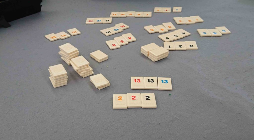 ラミーキューブ2回やりましたが、やはり最初の30点がなかなか作れない!じっと我慢して一気に出すという流れでした。1回目も2回目もあと1~2枚というところで他のプレイヤーに上がられてしまいました。