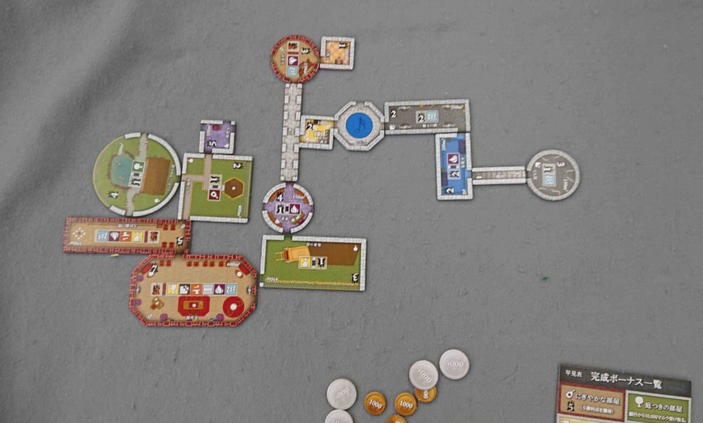 並べる部屋によって得点が変わります。相性の良い部屋(つなげると得点が入る)や逆に相性の悪い部屋(つなげると得点が減る)があります。部屋が完成する(部屋の通路が全部つながる)といろいろなボーナスがあります。