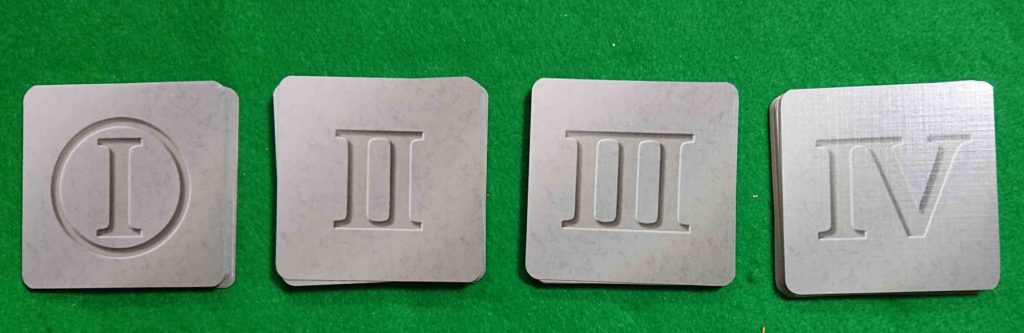 建物カードは、裏にⅠ~Ⅳまでの数字が描かれています。山札をこの数字ごとに作ります。3人以下ならⅠからⅢまで、4人ならⅠからⅣまでのカードを使います。