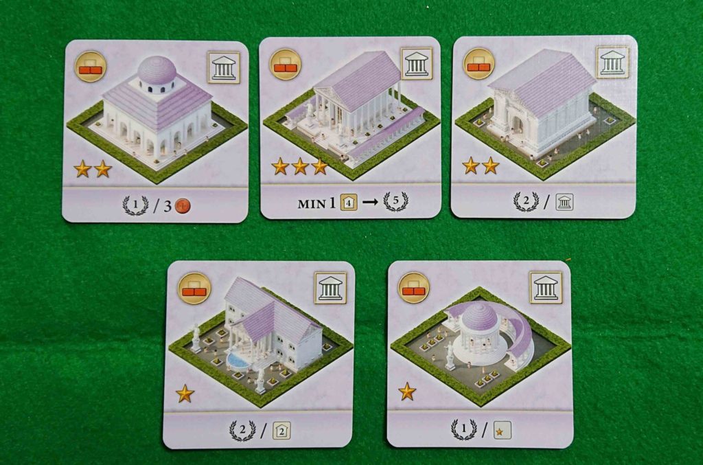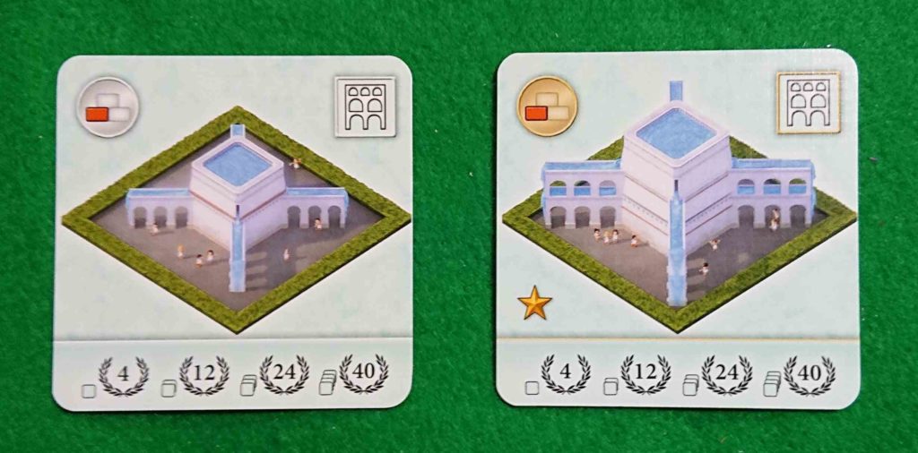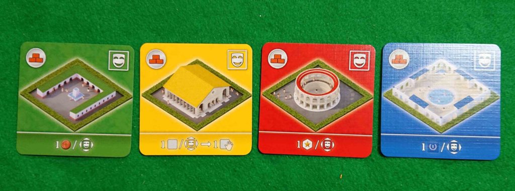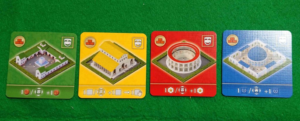 下の写真は公共施設カードの上位版で左からフォルムロマヌム・大学・コロッセウム・皇帝浴場です。普通の公共施設カードよりボーナスを多くもらうことが出来ます。