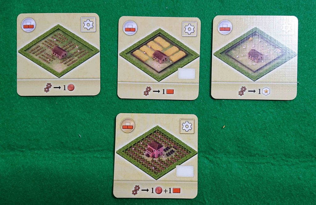 左から、野菜畑(お金1生産)・小麦畑(レンガタイル1個をカードの上に置く。このレンガは好きなラウンドで使用できる)・羊牧場(影響力1生産)・ブドウ畑(金1・レンガ1生産)です。