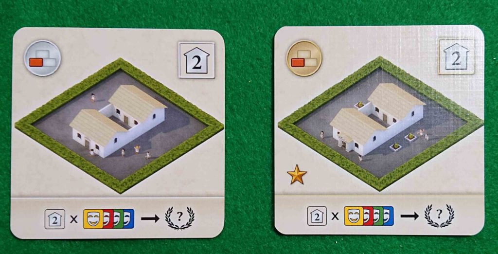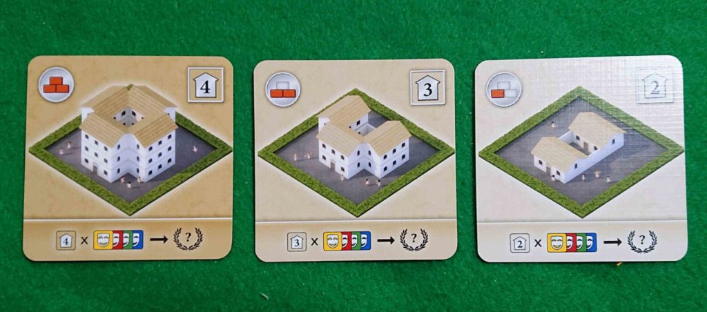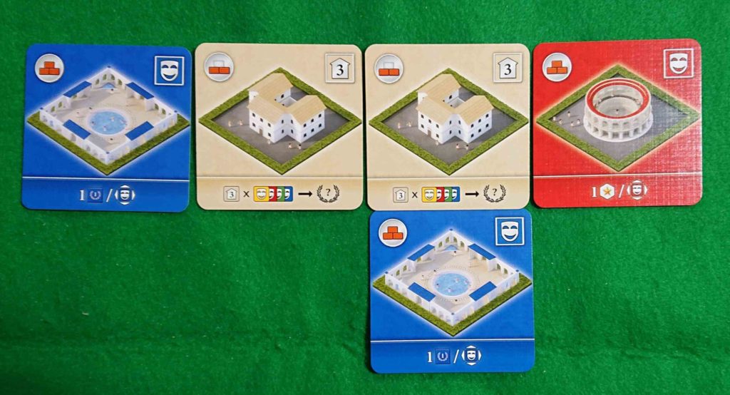 プレイヤーは建物カードを場に配置して4✖4の自分のローマの街を建設していきます。建物カードはいろいろな種類のカードがありそれぞれ特徴があります。