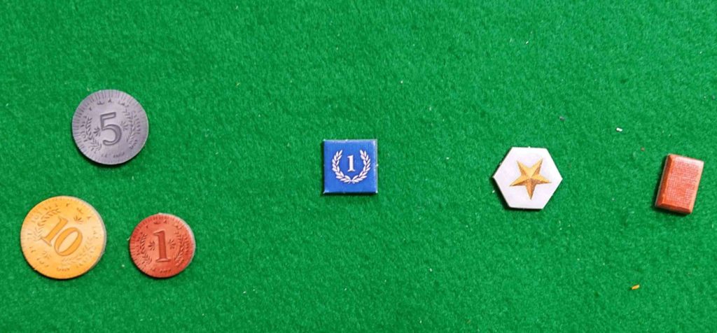 左から、お金チップ・得点チップ・影響力チップ・レンガチップです。