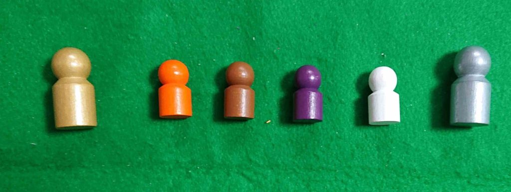 中央の4個がプレイヤーの使者コマです。左端は皇帝コマ右端はスタートプレイヤーコマです。