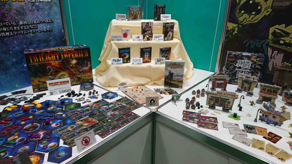 新作発売予定のボードゲームもいろいろ展示されていました。最近はコマがいろいろ凝ったデザインのものがたくさん出始めていますね。「スターシップサムライ」のコマもかなり凝った造りをしてますね!