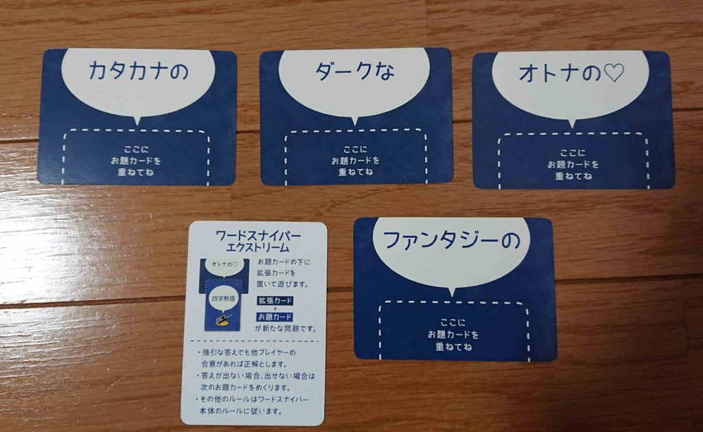 「ワードスナイパー」は私が好きなゲームの1つです。丁度拡張を見かけたので買っておきました。言葉のカードをこのカードの上に置きます。そして、その言葉に制限がかかるという拡張です。