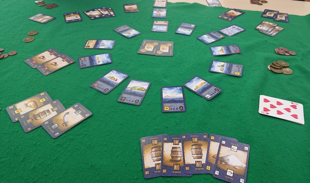 今回は海が舞台になります。円形に並べられたカードが海にある港を表現しています。プレイヤーは海で交易品を売りお金を稼いでいきます。港は各ラウンド2枚がオープンされた(交易品の取引が出来る)状態になっています。