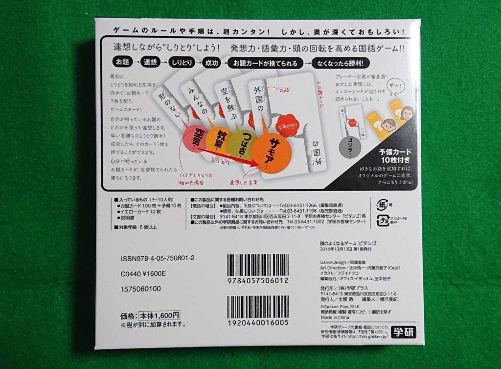 お題にピタッと合う言葉を連想するしりとりカードゲームです。言葉系のカードゲームはたくさん出いますが、面白いゲームの割合が高い気がします。
