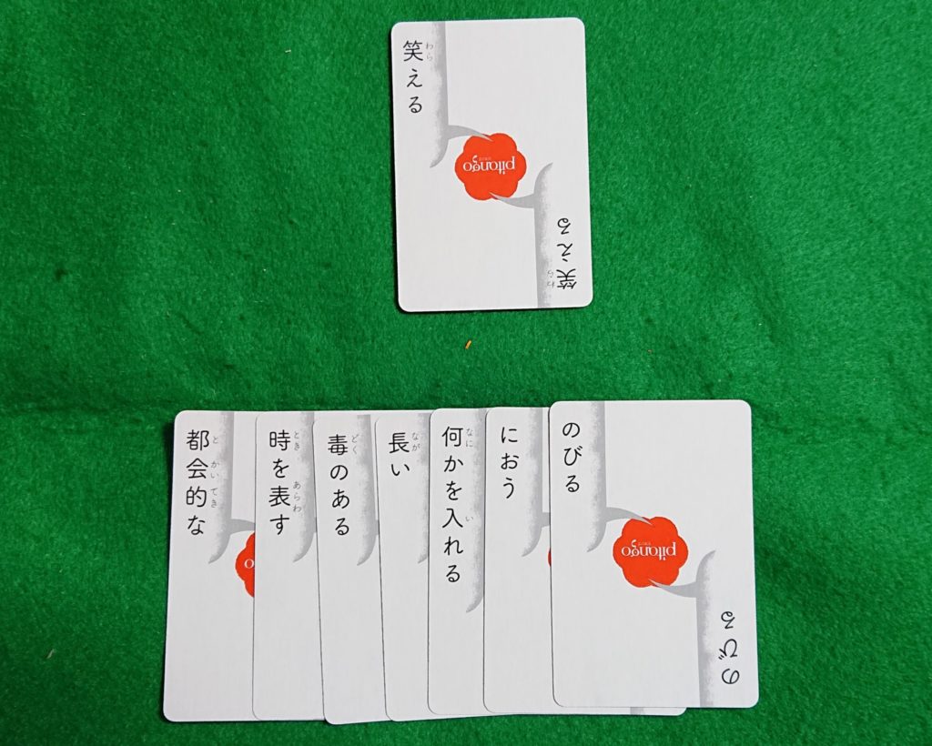 各プレイヤーは配られたお題カードを見て、そこにある言葉から連想されるものを言ってカードを出します。カードを出すのは早いもの勝ちです。
