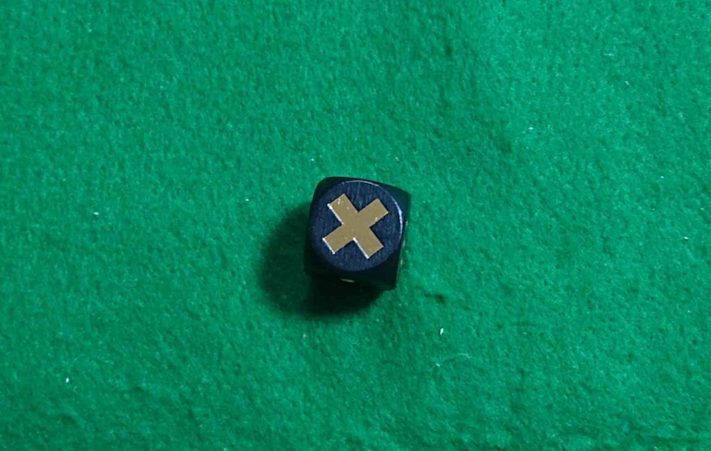 サイコロです。1から4の目があり、残り2面には✖が描かれています。