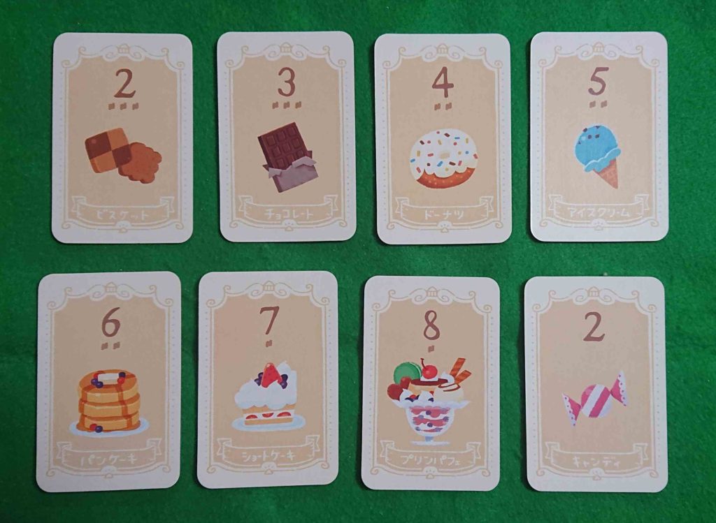 お菓子カードです。8種類あり、数字は獲得した時の得点です。