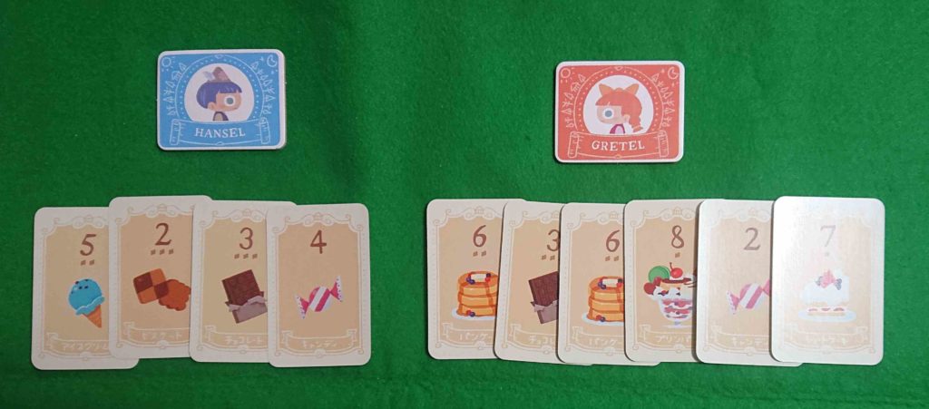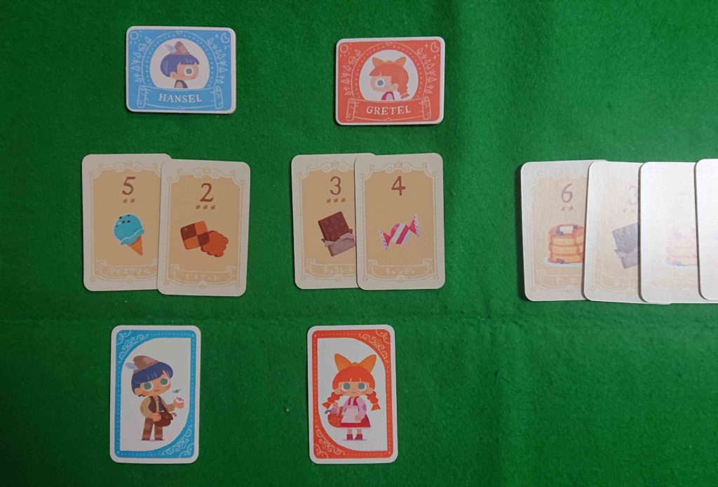 1.残っているカードが2枚以上の時は再びヘンデルかグレーテルを行います。つまり、そのカードの並びを2つに分けて、その上側にヘンゼルタイルとグレーテルタイルを置きます。
