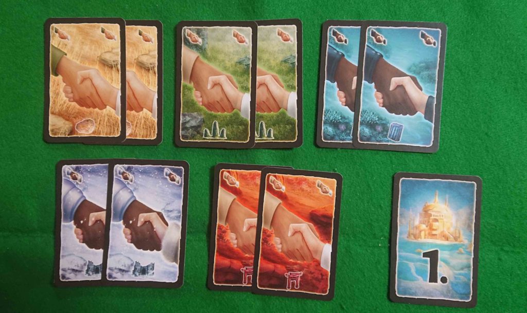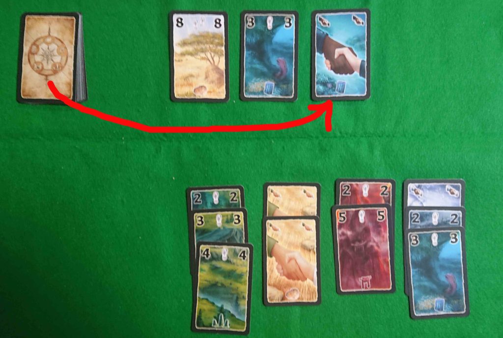 山札から1枚めくり表にして山札の横に置きます。以降各プレイヤーが「発見」を選んだら、カードが1列に並ぶように並べます。これを市場と呼びます。