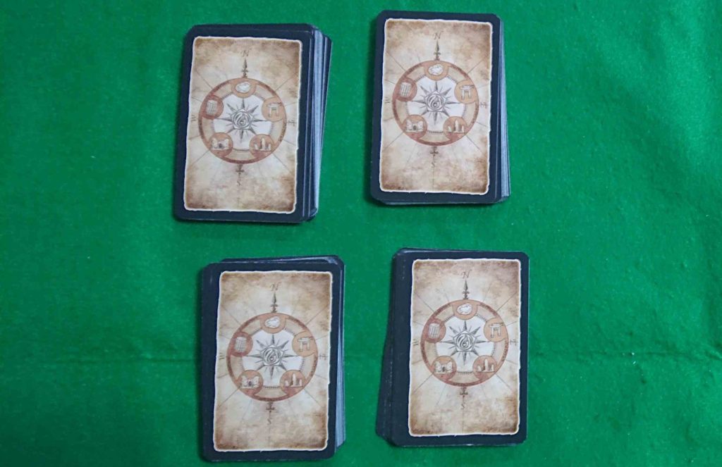 探検カードと投資カードを混ぜてよくシャフルして、山札を4つ作ります。