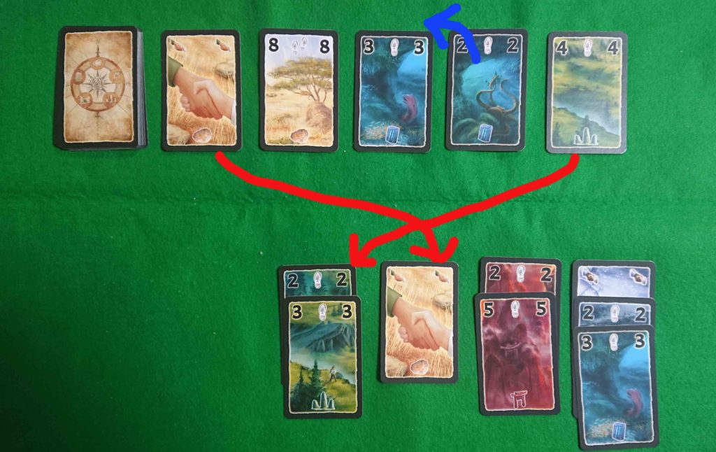下の写真の場合、赤い矢印のカードは自分前に並べ、青の矢印のカードは捨てました。