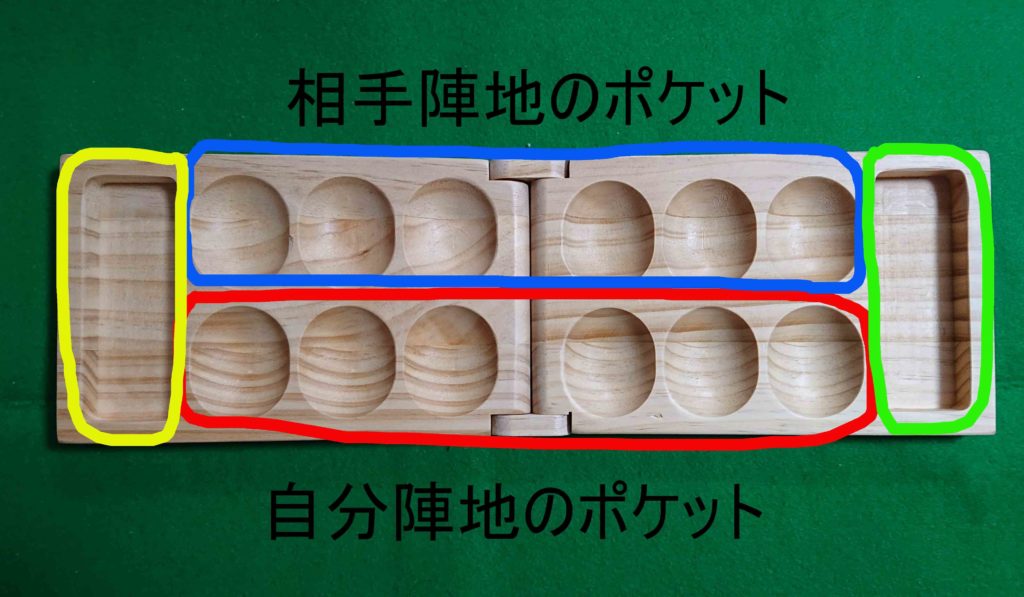 ボードの手前が自分の陣地のポケット、上が相手の陣地のポケットです。